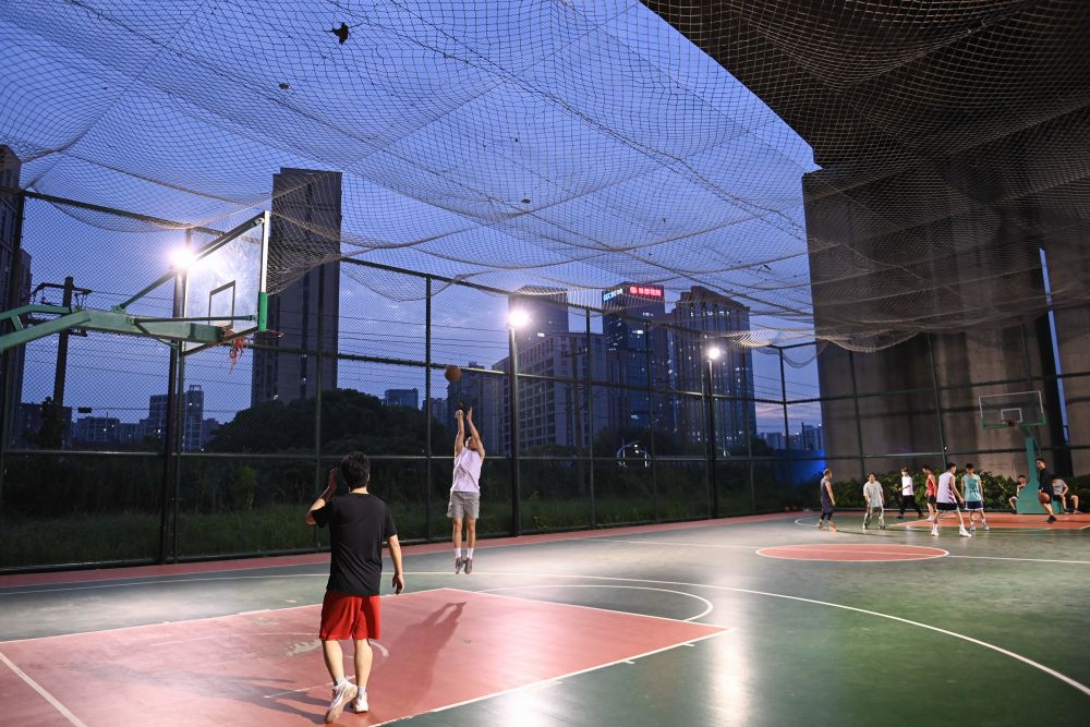 2022年9月20日,市民在位于高鐵橋下的錢江世紀城體育公園打籃球。在杭州,一批運動場館見縫插針地“嵌入”市民生活圈,城市空間的“邊角余料”正成為全民健身的“金角銀邊”。新華社記者 黃宗治 攝