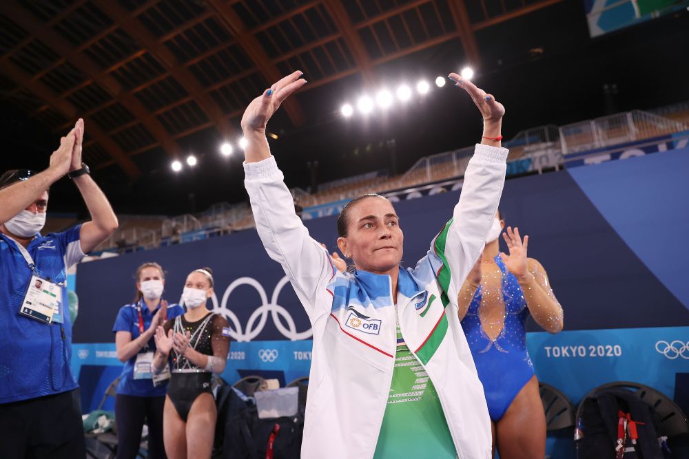 2021年7月25日,46歲的烏茲別克斯坦體操名將丘索維金娜在東京奧運會體操女子資格賽后向觀眾揮手致意。新華社記者 曹燦 攝