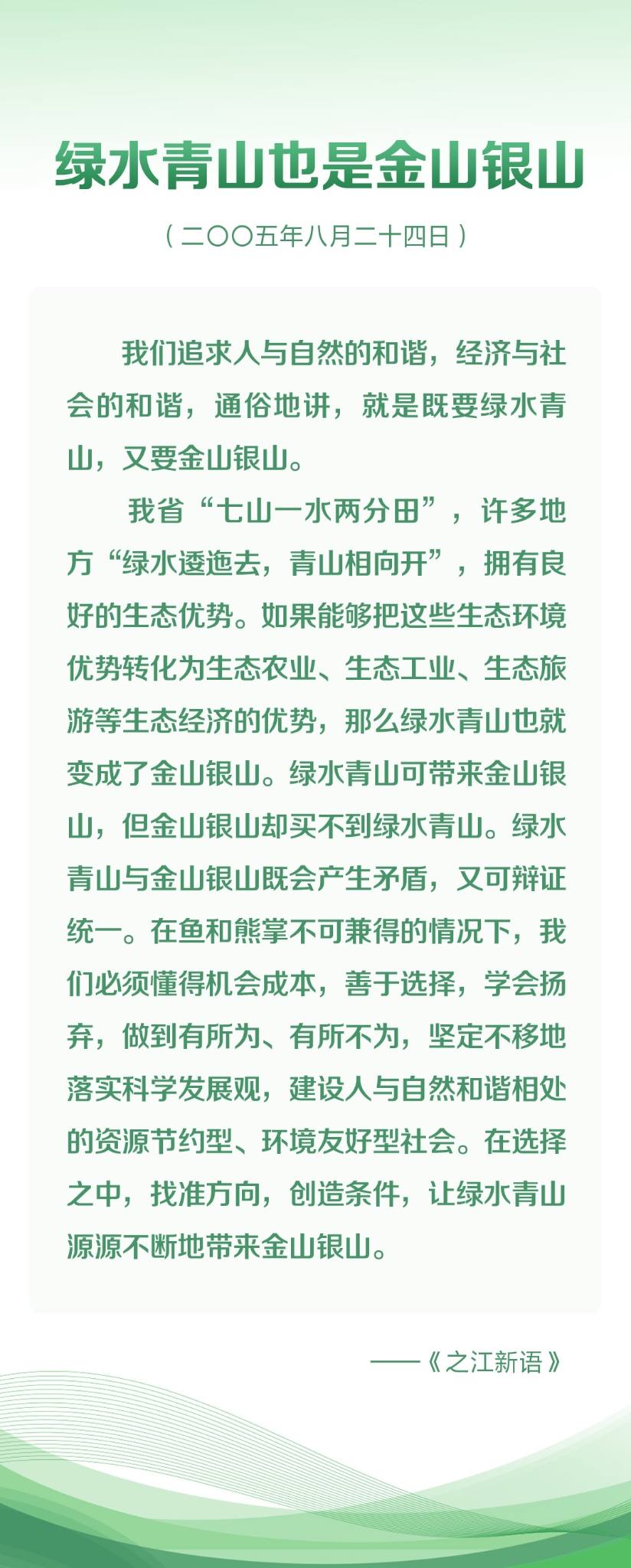 考察結(jié)束后,習近平在浙江日報《之江新語》專欄發(fā)表了《綠水青山也是金山銀山》一文。