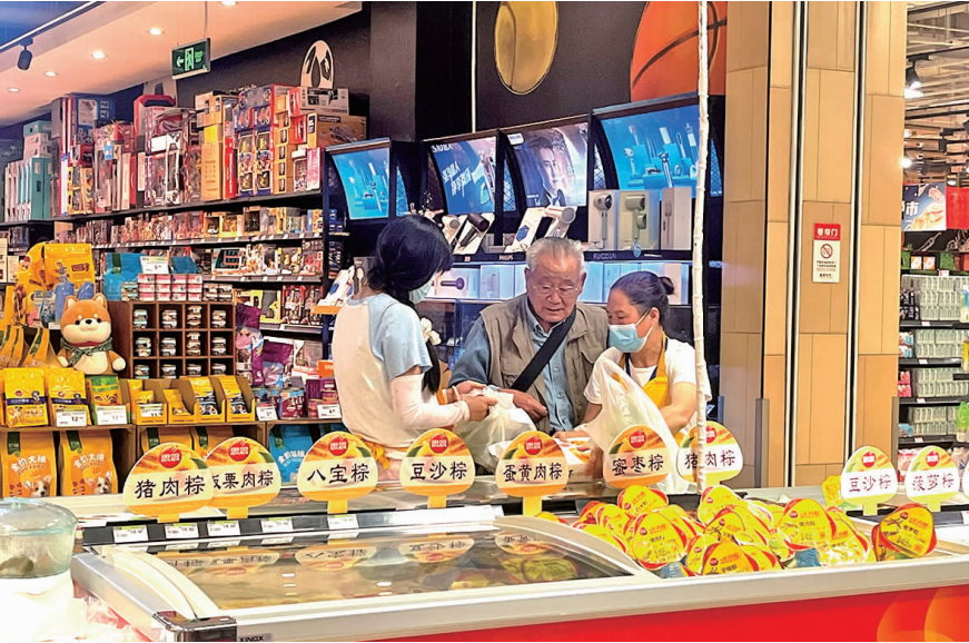各大超市同步開啟了促銷活動,滿減、現(xiàn)場試吃十分熱鬧。有的銷售員甚至幫忙進行個性化粽子挑選、搭配服務。