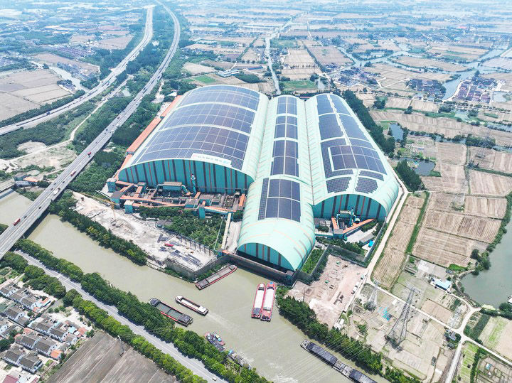 6月9日無人機(jī)拍攝的常熟市龍騰特種鋼有限公司碼頭料場屋頂光伏。
