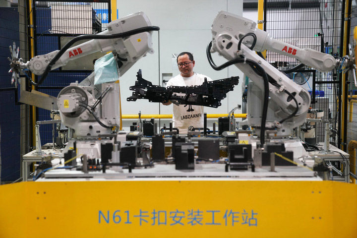 6月7日,在江蘇常熟汽飾集團(tuán)生產(chǎn)車間,工人在卡扣自動化安裝工作站上料。