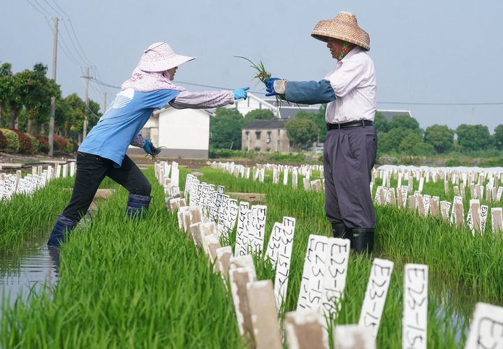 6月6日,常熟市農(nóng)科所水稻育種專家端木銀熙(右)和技術(shù)人員一起在秧田拔除雜株,檢查秧苗生長情況。
