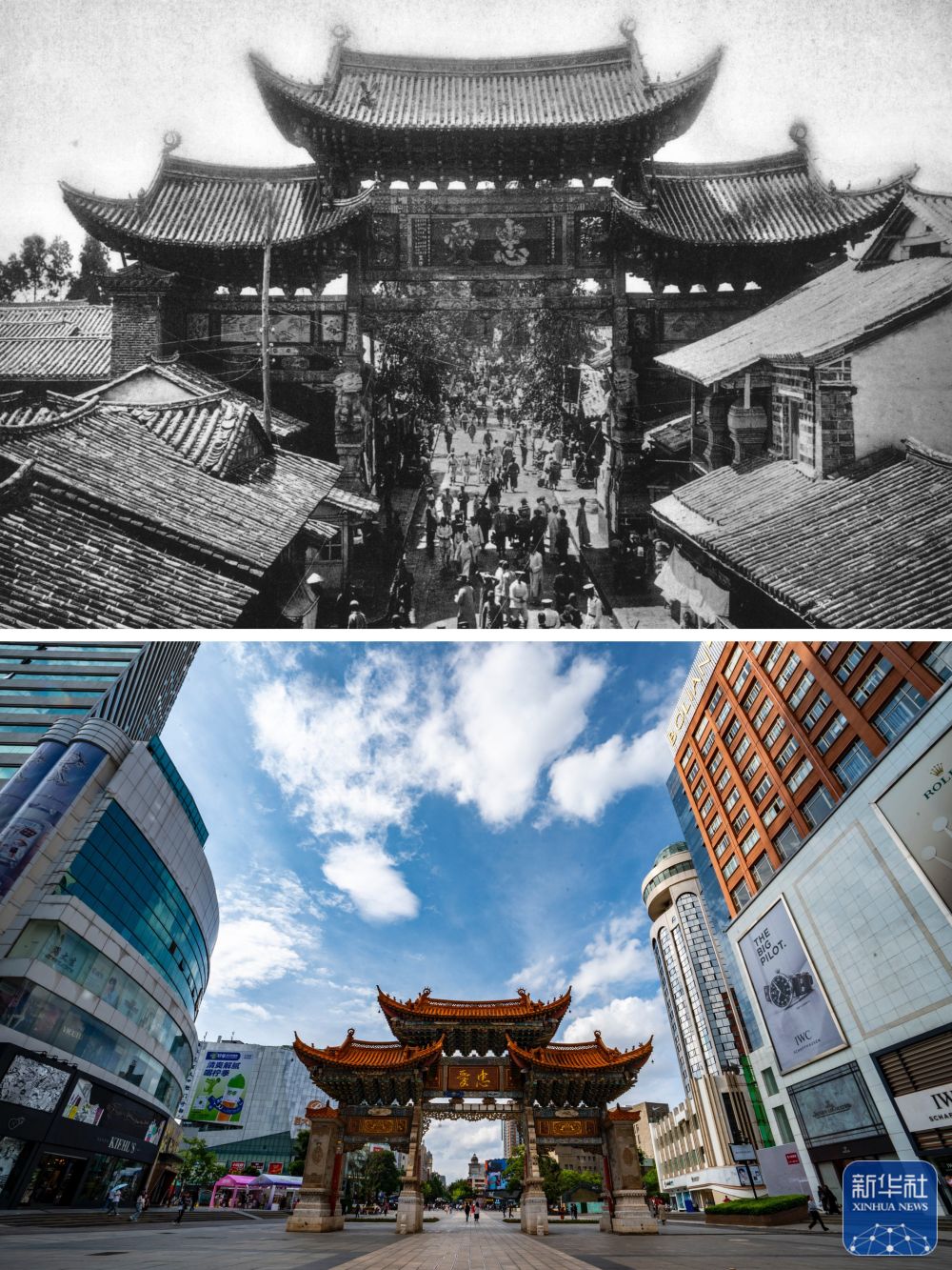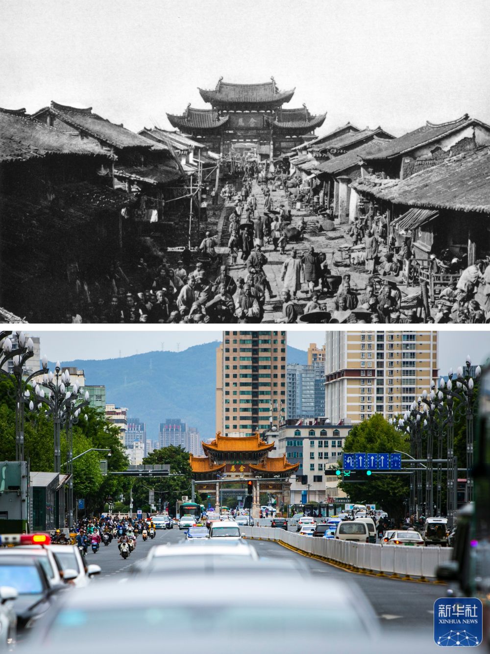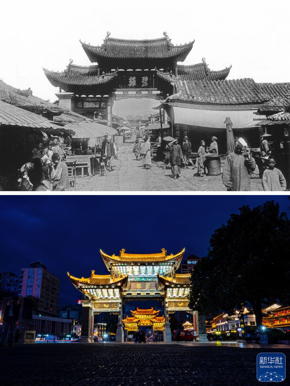 拼版照片:上圖為清末時期的昆明碧雞坊。(資料圖片 殷曉俊提供)