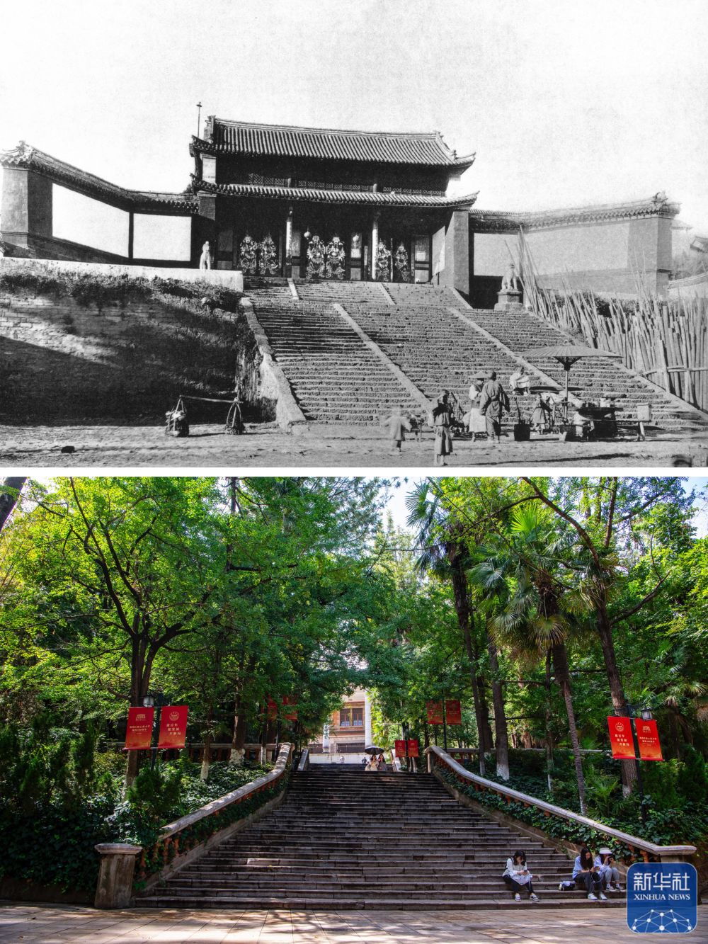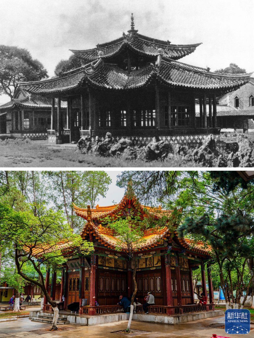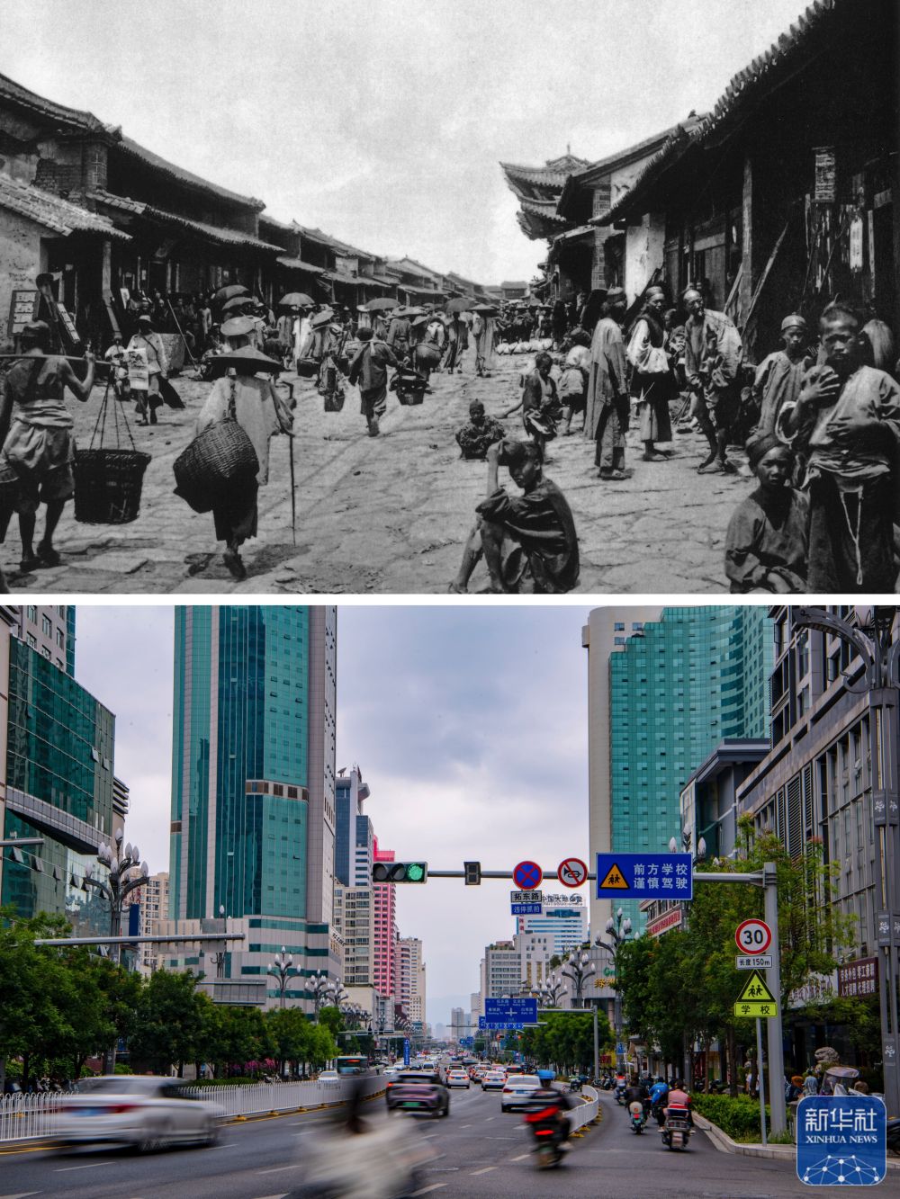 拼版照片:上圖為清末時期的昆明碧雞坊。(資料圖片 殷曉俊提供)