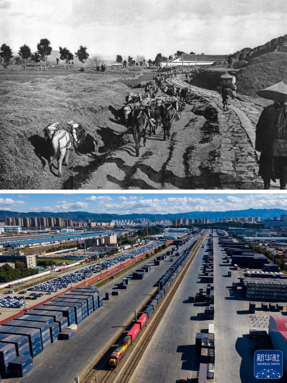 拼版照片:上圖為清朝末年,馱運著貨物的馬幫準(zhǔn)備進(jìn)入昆明城區(qū)。(資料圖片 殷曉俊提供)