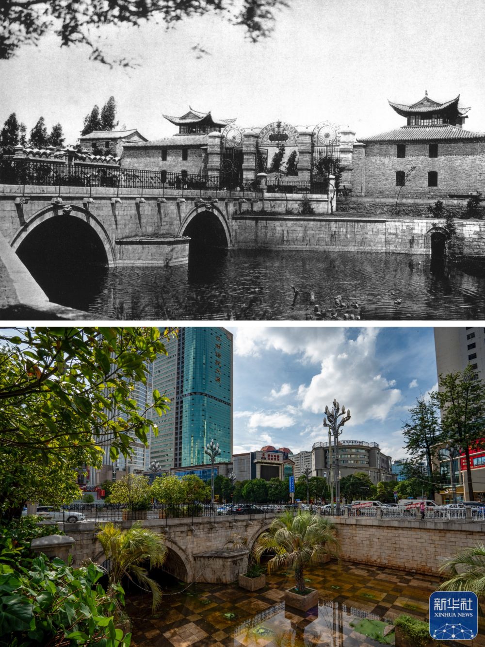 拼版照片:上圖為曾經(jīng)的昆明護(hù)國橋與護(hù)國門。(資料圖片 殷曉俊提供)