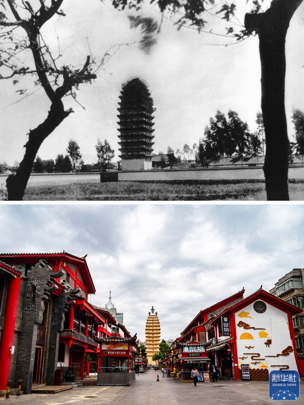 拼版照片:上圖為曾經(jīng)的西寺塔(資料圖片 殷曉俊提供)。西寺塔始建于唐代,清朝道光年間曾毀于地震,光緒年間重建。