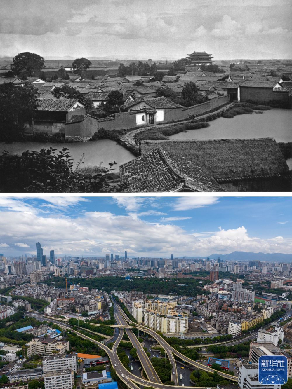 拼版照片:上圖為清朝末年的昆明城東小菜園一帶民居。(資料圖片 殷曉俊提供)