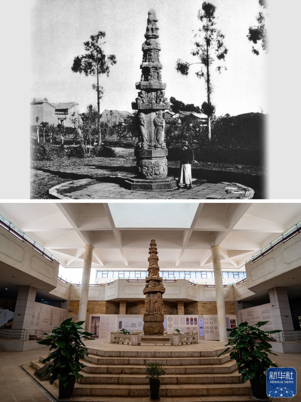 拼版照片:上圖為曾經(jīng)位于昆明古幢公園內(nèi)建于宋代的地藏寺經(jīng)幢(資料圖片 殷曉俊提供),此幢雕刻精美,被譽(yù)為“滇中藝術(shù)之極品”。