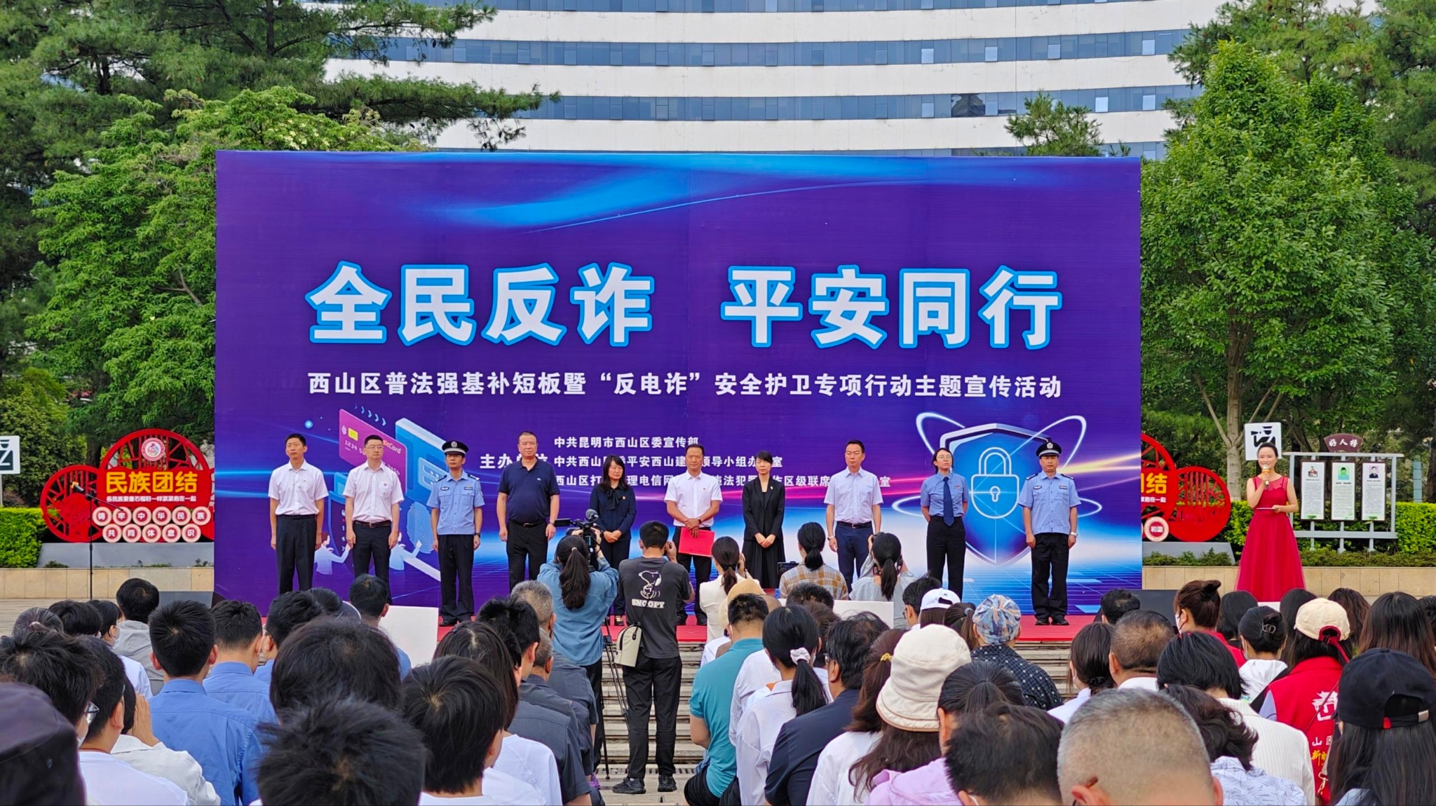 昆明信息港訊 記者楊錦佳 通訊員李冰潔 6月20日,西山區(qū)普法強基補短板暨“反電詐”安全護衛(wèi)專項行動在碧雞廣場正式啟動。由西山區(qū)政法隊伍、各部委辦局、10個街道,124個社區(qū)及社區(qū)網(wǎng)格員,金融系統(tǒng)、電信系統(tǒng)、保險系統(tǒng)和轄區(qū)工商戶、環(huán)衛(wèi)工人等21支宣傳方陣組成的千人“反電詐”安全護衛(wèi)宣傳隊伍“整裝待發(fā)”,用實際行動切實守護好老百姓的“錢袋子”。