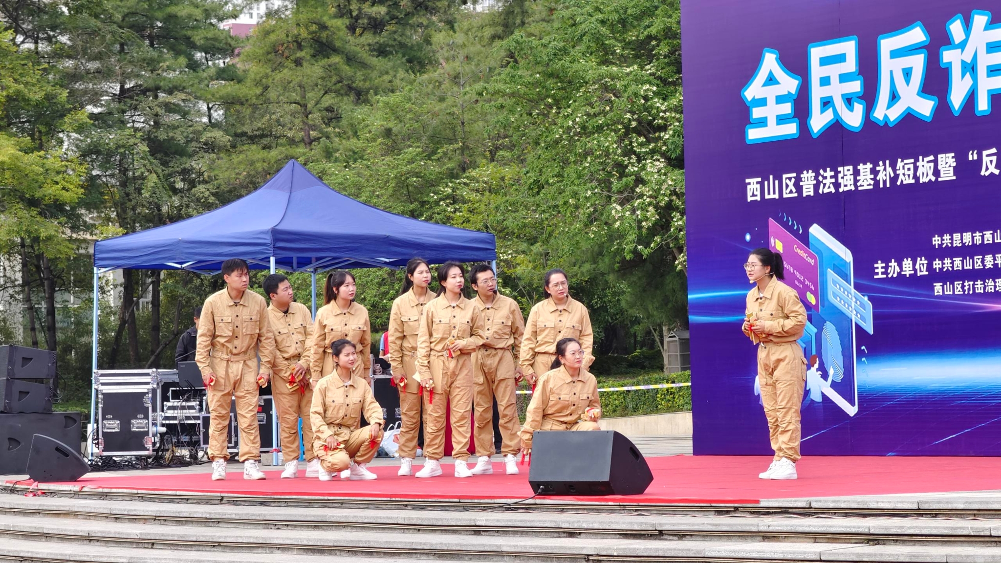 “凡事多一個心眼,謹(jǐn)防上當(dāng)受騙!”在“我是‘反詐’最強音”環(huán)節(jié)中,21支宣傳方陣用鏗鏘有力的口號讓大家形成強有力的記憶,時刻提醒群眾防范電信詐騙的各種陷阱。隨后,群口快板《幸福生活天天見》、脫口秀表演、Rap《管好你的卡》……生動形象的現(xiàn)實案例,“反電詐”宣傳變得通俗易懂、趣味十足,用寓教于樂的方式給現(xiàn)場的群眾普及了“反電詐”知識。期間穿插的知識有獎問答活動,現(xiàn)場觀眾積極舉手答題,臺上臺下互動頻繁,氣氛熱烈。此外,現(xiàn)場還通過設(shè)立咨詢臺,發(fā)放宣傳資料,設(shè)置展板、橫幅等方式,向群眾宣傳“反電詐”知識。