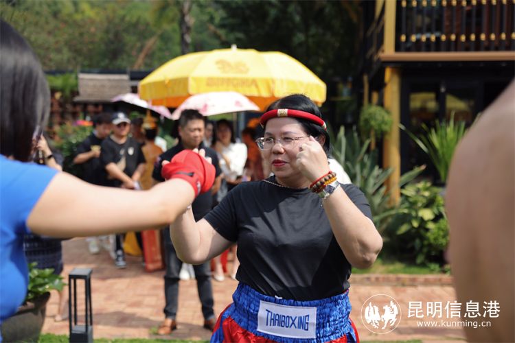 推廣活動(dòng)中,泰王國駐昆明總領(lǐng)事帕薇婉現(xiàn)場參與泰拳的互動(dòng)體驗(yàn),身體力行推廣泰拳文化。供圖