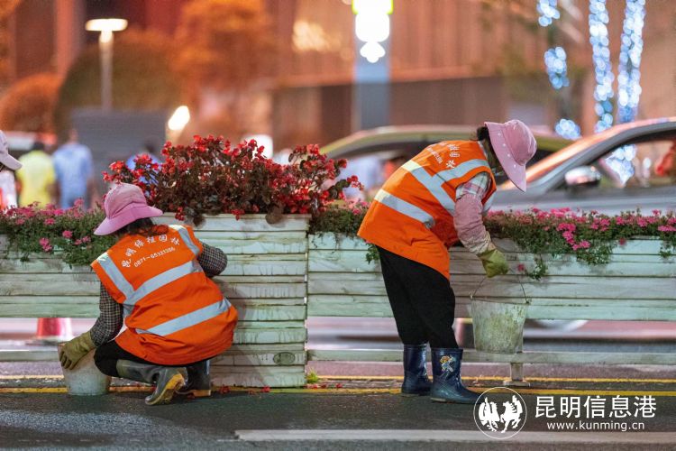 此外,為了避免正午高溫時土壤突然受到冷水刺激,影響作物生長,園林工人們還需要在白天的工作結(jié)束后,夜間加班進行澆水。燈火通明的夜晚,人流稀少的街道,噴灑的水霧與工人的汗珠在城市夜間的霓虹中閃爍,當(dāng)車水馬龍歸于寧靜,只有夜里吹過的涼風(fēng)和濕潤的泥土氣息伴著這群忙碌的園林人一同前行。正是這群城市里的園林工人們?nèi)蝿谌卧?、夜以繼日地堅守,才使得昆明這座城市依然綠色盎然。