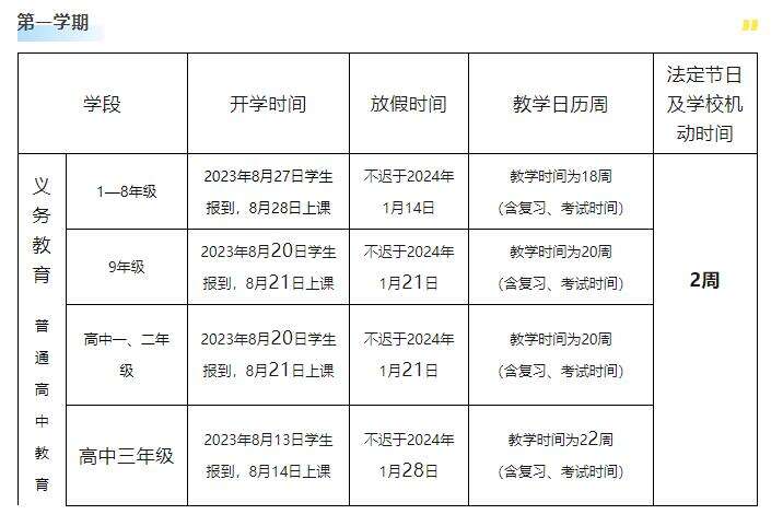 根據(jù)國家課程設(shè)置方案,結(jié)合我省實(shí)際,省教育廳日前印發(fā)通知,公布《2023—2024學(xué)年普通中小學(xué)校教學(xué)日歷》(以下簡稱教學(xué)日歷)。