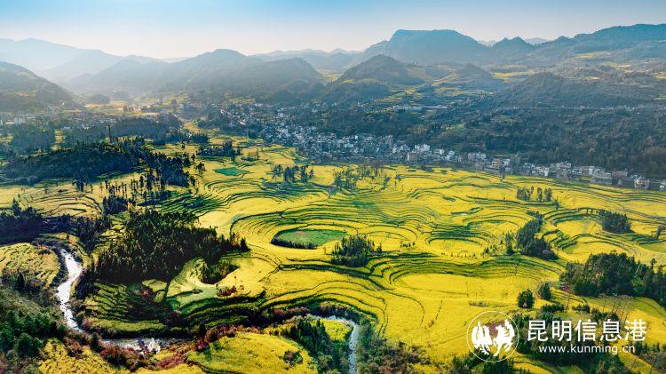早春,羅平螺絲田的油菜花盛開,田園、村莊、河流、群山,天然的線條與色塊,組合成云南最美的春色。