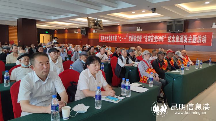 昆明信息港訊 記者甘凌菲 通訊員羅敬剛 為慶祝中國(guó)共產(chǎn)黨成立102周年,切實(shí)落實(shí)黨內(nèi)關(guān)懷,開展黨性教育,增強(qiáng)黨員的歸屬感、使命感,凝聚黨內(nèi)磅礴力量。6月29日,昆明經(jīng)開區(qū)阿拉街道航天社區(qū)開展了“七一”專題黨課暨“光榮在黨50年”紀(jì)念章頒發(fā)主題活動(dòng),共200余名黨員參與。