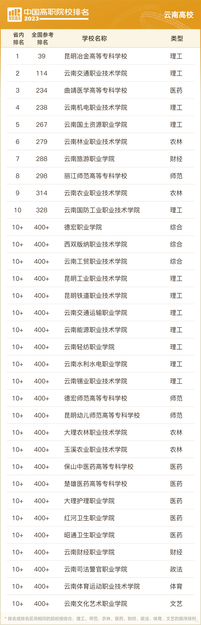 本次排名中,云南省共有33所公辦高職院校上榜,其中,被列為“雙高計(jì)劃”高水平學(xué)校建設(shè)單位的昆明冶金高等??茖W(xué)校領(lǐng)跑全省高職院校。曲靖醫(yī)學(xué)高等??茖W(xué)校在醫(yī)藥類分榜中位列全國第8名,表現(xiàn)不凡。麗江師范高等??茖W(xué)校位列師范類分榜全國第14名。在民辦高職榜單中,云南省共有8所學(xué)校上榜,其中,云南經(jīng)貿(mào)外事職業(yè)學(xué)院位列全省民辦高校第一。