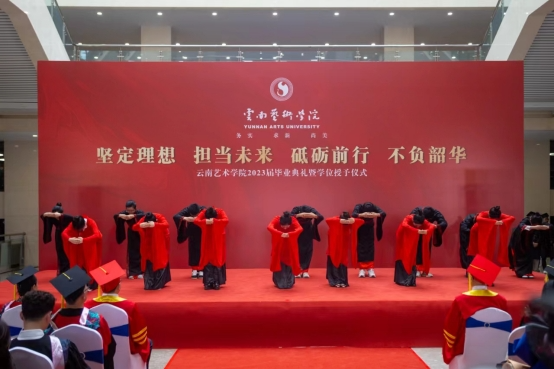 昆明信息港訊 “吾等自入校以來,累受師長(zhǎng)教育之恩,沒齒難忘。憶往初,師者傳道受業(yè),同窗青藍(lán)互滋。今吾等懷感激涕零之心境,謹(jǐn)祝母校登高望遠(yuǎn),桃李芬芳?!痹颇纤囆g(shù)學(xué)院2023屆畢業(yè)典禮上,23位畢業(yè)學(xué)子身著傳統(tǒng)漢服、行揖拜之禮,表達(dá)對(duì)師者的敬謝之恩。