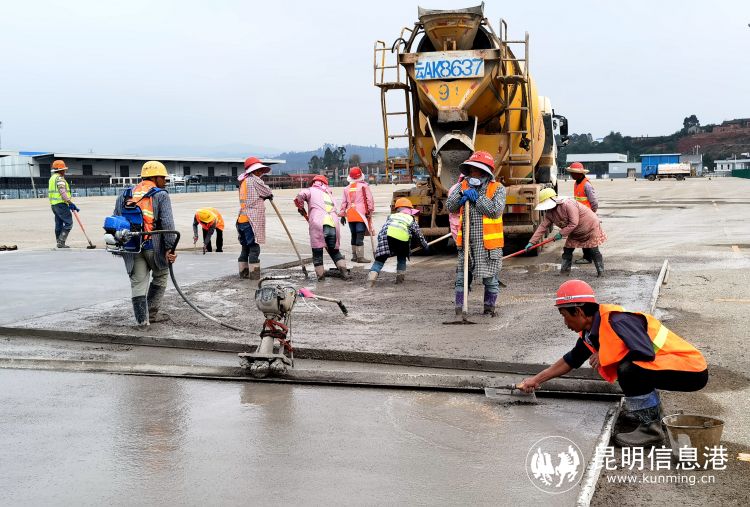 基地施工過程中,工人認真澆筑路基混凝土。鄧皓文 攝