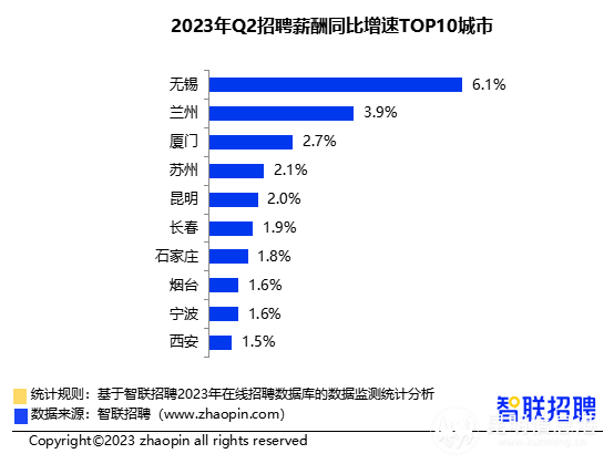 從38個城市二季度薪酬同比增速來看,無錫穩(wěn)居榜首,達(dá)到6.1%,蘭州以3.9%位列第二,廈門以2.7%排名第三。蘇州、寧波同比增速分別為2.1%、1.6%,排名第四位和第九位。昆明以2.0%的增速位列第五名。分析認(rèn)為,無錫、蘇州和寧波的電子技術(shù)/半導(dǎo)體/集成電路行業(yè)企業(yè)招聘月薪較去年同期分別增長8.6%、5.8%和10.7%,儀器儀表及工業(yè)自動化行業(yè)同比分別上漲7.1%、6.9%和15.3%。憑借優(yōu)越的區(qū)位條件和產(chǎn)業(yè)基礎(chǔ),長三角城市相互賦能、輻射帶動,地區(qū)智能制造行業(yè)發(fā)展勢頭強(qiáng)勁,企業(yè)紛紛高薪納才。