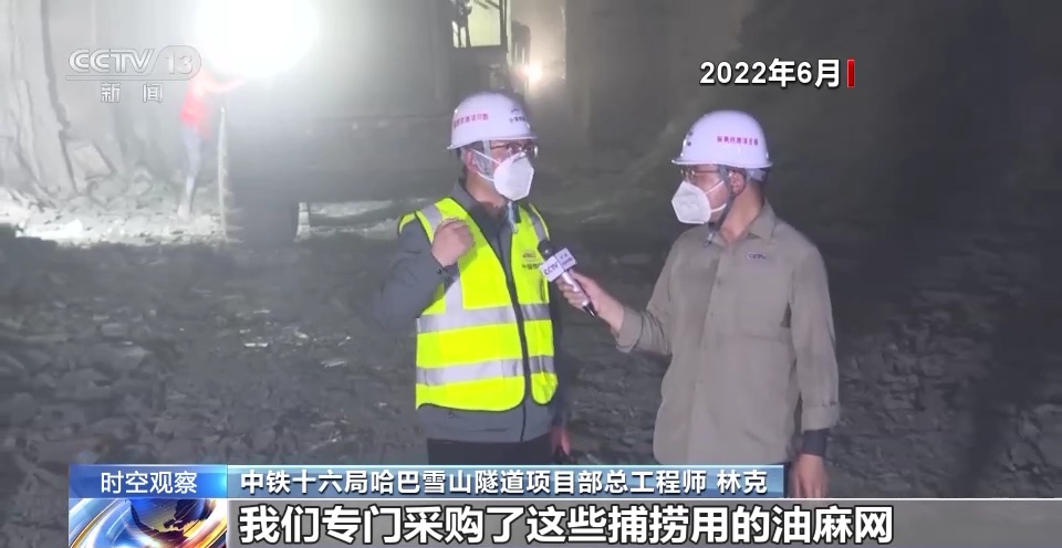 中鐵十六局哈巴雪山隧道項(xiàng)目部總工程師 林克:我們專門采購了這些捕撈用的油麻網(wǎng),然后掛在拱頂,防止掉石塊傷人,這個網(wǎng)的承重,每張網(wǎng)大概能承受500到800公斤的重量。
