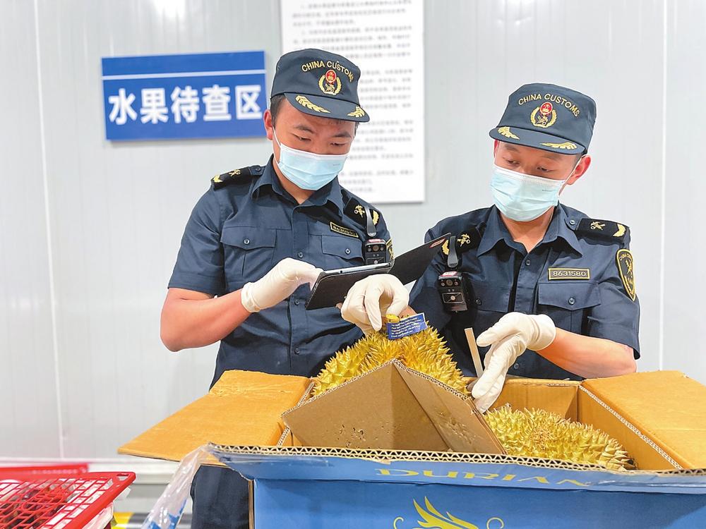 海關(guān)關(guān)員對(duì)通過(guò)中老鐵路入境的榴蓮進(jìn)行查驗(yàn)。 供圖