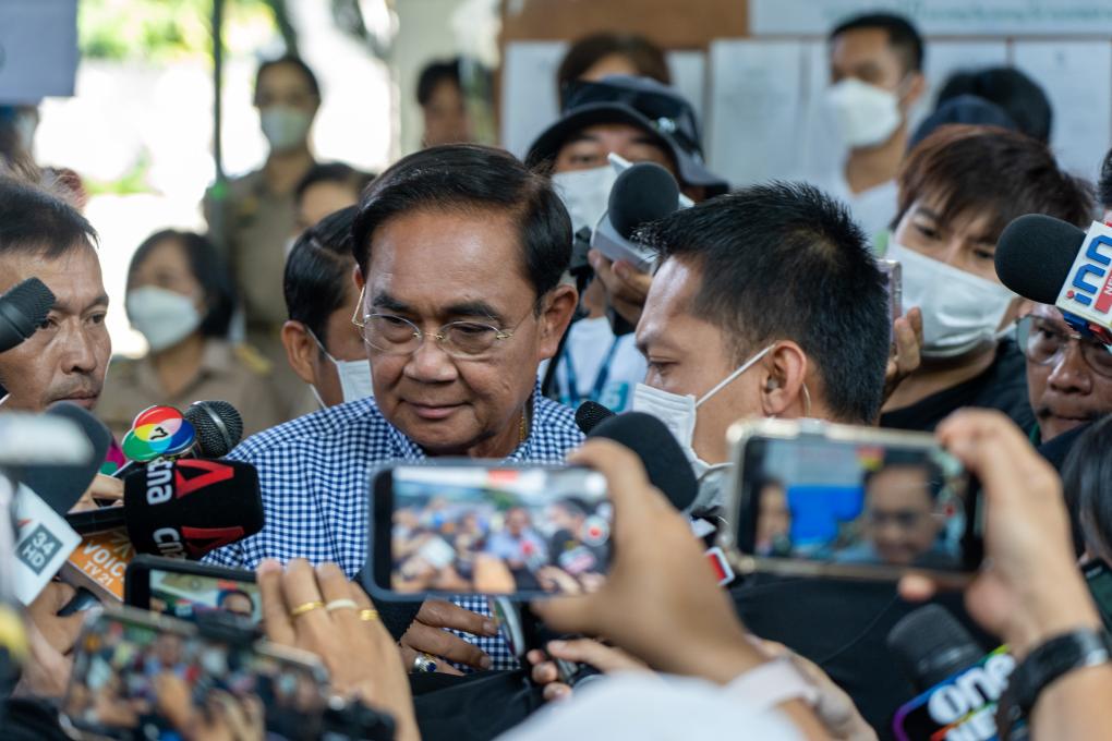 5月14日,泰國總理巴育(中)在曼谷一處投票站接受媒體采訪。泰國14日舉行國會下議院選舉,改選下議院全部500個議席。新華社記者林昊攝