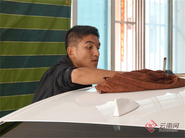 天生的缺陷讓盧國偉無法像普通人那樣生活工作,但家人的愛為他撐起一片天。一直以來,一家人都共同居住在硯山縣小興街的樓房里,在奶奶去世、哥哥和堂弟外出工作后,三代同堂的8口之家變成5人。大伯盧云斌和伯母田春花照顧著一家老小,在一樓開了個洗車鋪子,盧國偉和父親盧云龍平時就在店里洗車。由于店面不靠主路且狹窄,基本都是街坊和熟人照顧生意。即使一天只有一輛車,盧國偉也盡力做到最好?!斑€有客人專門過來找小偉洗呢。”田春花說。