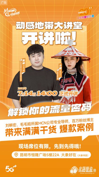視頻不會(huì)做、內(nèi)容沒(méi)熱度?如何才能正確解鎖“流量密碼”,打造爆款賬號(hào)?云南移動(dòng)首屆動(dòng)感地帶大講堂即將開(kāi)講!為大家?guī)?lái)滿滿干貨和爆款案例。7月14日14時(shí),云南移動(dòng)為大家?guī)?lái)的動(dòng)感地帶大課堂將在昆明市恒隆廣場(chǎng)5樓22A大象好在(大象書(shū)店)正式開(kāi)講。