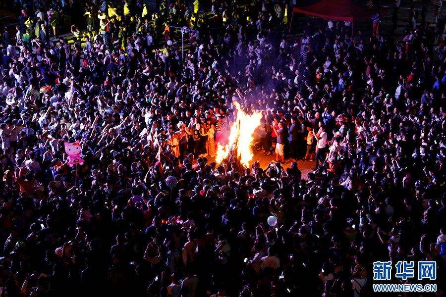 人們圍繞著廣場(chǎng)中心的巨型火把,載歌載舞(資料圖)。新華網(wǎng)發(fā)(楊躍 攝)