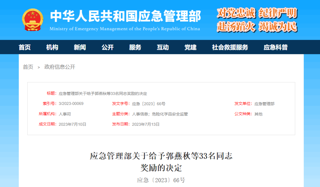 應(yīng)急管理部關(guān)于給予郭燕秋等33名同志