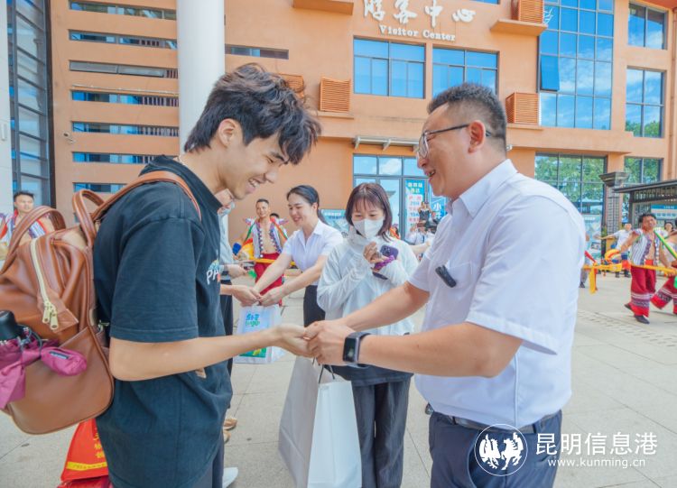 在彌勒高鐵站出站口,潘金軍熱情地與出站游客握手交流,贈送小禮品,并為游客們介紹彌勒的各個景點,以及暑假期間推出的一系列特色文旅活動和優(yōu)惠政策。
