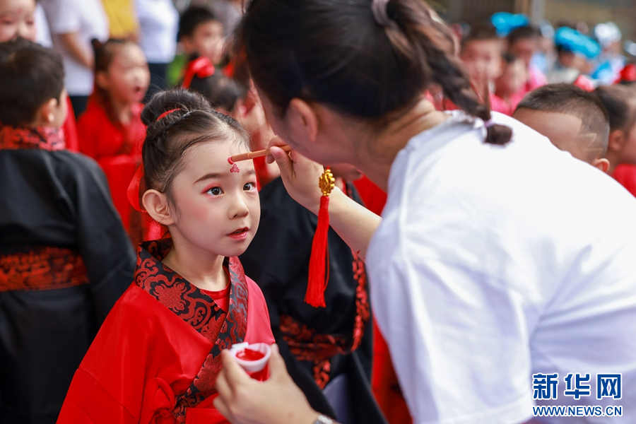 老師為小朋友點上朱砂,寓意開啟智慧之門(攝于7月14日)。新華網(wǎng)發(fā)(陶家淇 攝)