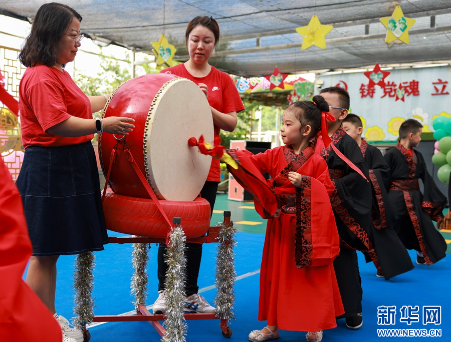 小朋友們排隊完成擊鼓明志環(huán)節(jié)(攝于7月14日)。新華網(wǎng)發(fā)(陶家淇 攝)