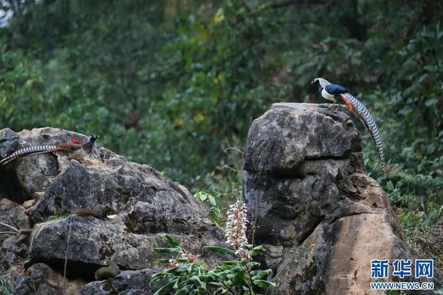 白腹錦雞和松鼠同框(7月7日攝)。新華網(wǎng)發(fā)( 尹磊 攝)