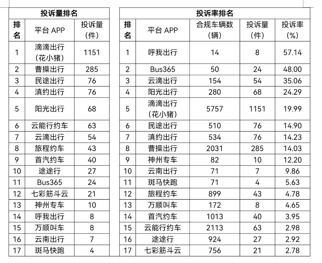 在涉及昆明市主城五區(qū)18家網約車平臺公司的服務投訴排名中,投訴總量排名前五位的是“滴滴出行(花小豬)”“曹操出行”“民途出行”“滇約出行”和“陽光出行”;按照投訴量與合規(guī)網約車比例計算投訴率,排名前五位的是“呼我出行”“Bus365”“云滴出行”“陽光出行”“滴滴出行(花小豬)”。