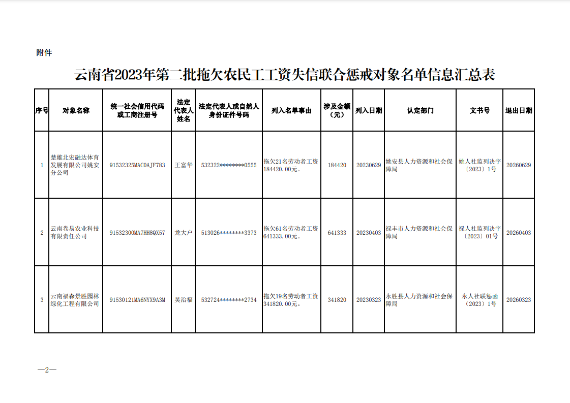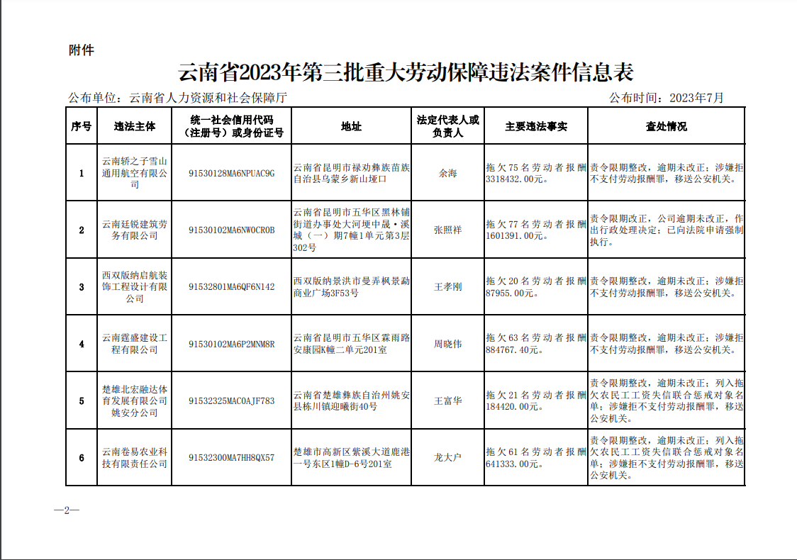 近日,為加大重大勞動保障違法行為懲戒力度,加強信用監(jiān)管,強化社會監(jiān)督,云南省人力資源和社會保障廳向社會公布了2023年第三批重大勞動保障違法案件和2023年第二批拖欠農(nóng)民工工資失信聯(lián)合懲戒對象名單。本次公布的重大勞動保障違法案件共6件,涉及6戶用人單位;公布的失信聯(lián)合懲戒對象名單共3條,涉及3戶用人單位。