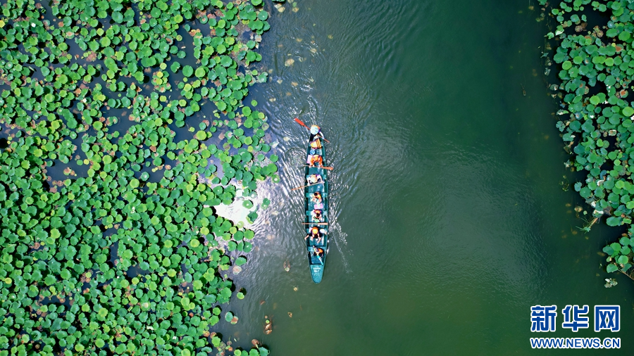 航拍視角下,一葉小舟劃行在普者黑國(guó)家濕地公園內(nèi)(攝于6月25日)。新華網(wǎng)發(fā)(楊紫軒 攝)
