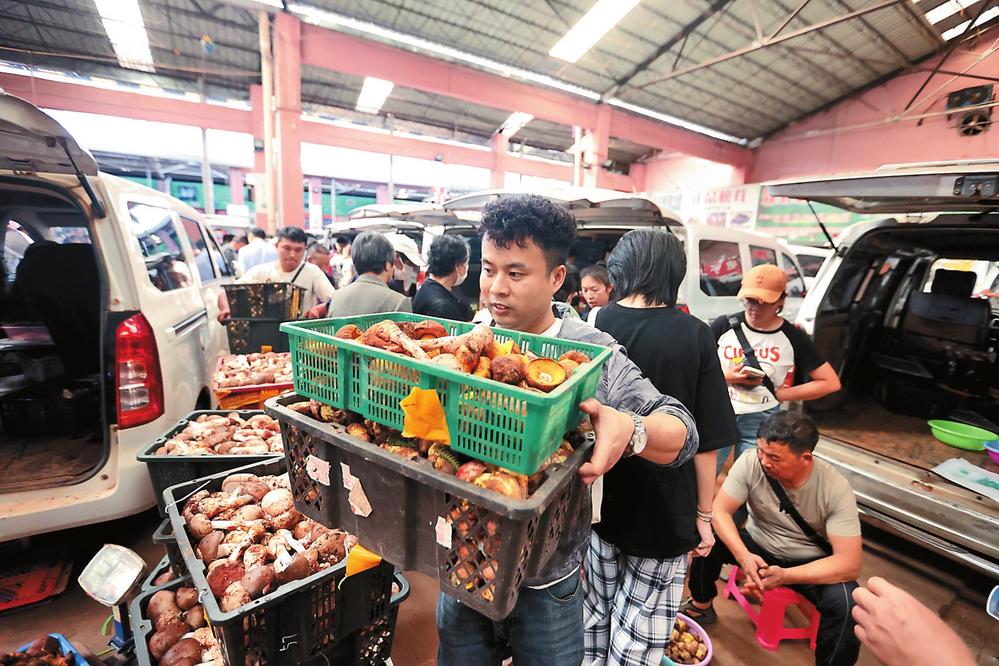 近期,伴隨雨季來臨,我省野生菌進入生長、銷售旺季。位于昆明的云南木水花野生菌交易中心是全國最大的野生菌交易市場,售賣雞樅、松茸、干巴菌等全國300種食用野生菌中的257種,市場份額占全國野生食用菌交易的80%左右,目前每天野生菌的上市量約為300噸,迎來野生菌銷售高峰,每天都有來自全國各地的客商在此進行交易。圖為市民在云南木水花野生菌交易市場選購野生菌。(云南日報記者 陳飛 攝影報道)