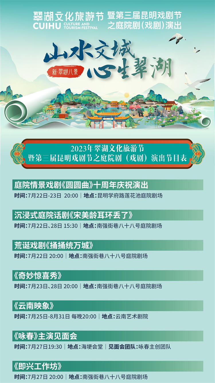 據(jù)了解,本屆昆明戲劇節(jié)之庭院劇演出季是2023年翠湖文化旅游節(jié)重點推出的活動之一,旨在以庭院劇為藝術(shù)載體,堅定戲劇文化自信,構(gòu)建起昆明歷史文化與大眾的精神情感共鳴,與市民游客一起感悟春城歷史文化魅力。