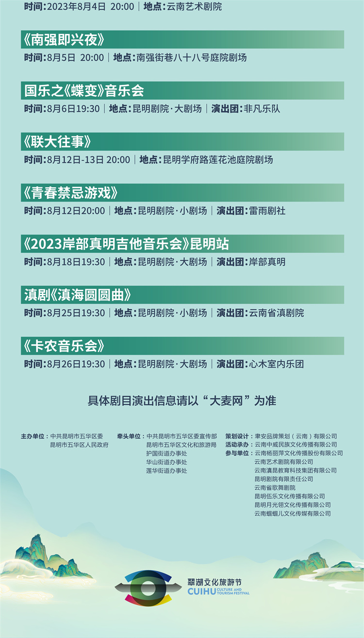 除蓮花池劇場外,活動期間,還將聯(lián)合南強街八十八號劇場、昆明劇院多個劇場,推出一系列優(yōu)秀劇目。同時,市民還可憑“五華文化惠民卡”享受觀劇福利,一同感受到中國傳統(tǒng)戲曲和現(xiàn)代戲劇的文化魅力,以及昆明歷久彌新的文化積淀和文化精神。(云南網(wǎng) 記者龍舟 楊崢)