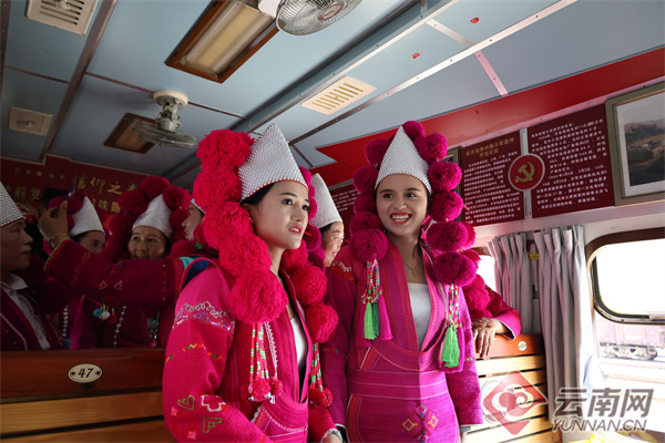 在小火車1號(hào)車廂的展銷臺(tái)上,云輝290、南疆白檸檬、甜藠頭等開(kāi)遠(yuǎn)特色產(chǎn)品琳瑯滿目。車廂內(nèi),游客們一邊欣賞沿線旖旎風(fēng)光,一邊品嘗當(dāng)?shù)禺a(chǎn)的大棗、葡萄、蜜桃等特色農(nóng)產(chǎn)品,彝族大姐則唱著歌兒挨個(gè)敬酒,歌聲、歡笑聲陪伴整個(gè)旅程。