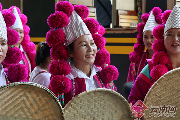 慶?;顒?dòng)上,身著“仆拉紅”、帽尖懸吊紅色線球的當(dāng)?shù)匾妥鍕D女在站臺(tái)上跳起簸箕舞。艷麗的民族服飾、歡快的舞蹈,猶如山間綻放的杜鵑花,引得圍觀游客紛紛拿出手機(jī)拍照留影,現(xiàn)場(chǎng)成為歌舞歡樂(lè)的海洋。