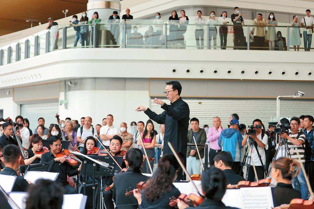 7月25日,在昆明機(jī)場(chǎng)S1衛(wèi)星廳的云南綠孔雀造型景觀前,來自聶耳交響樂團(tuán)的55名演奏者為旅客演奏了《金色狂舞》《滇池圓舞曲》《阿佤人民唱新歌》《我和我的祖國(guó)》《遠(yuǎn)方的客人請(qǐng)你留下來》等11首精彩曲目,吸引了大批旅客駐足欣賞,并用手機(jī)記錄下現(xiàn)場(chǎng)的精彩。(云南日?qǐng)?bào) 記者 陳飛 攝)