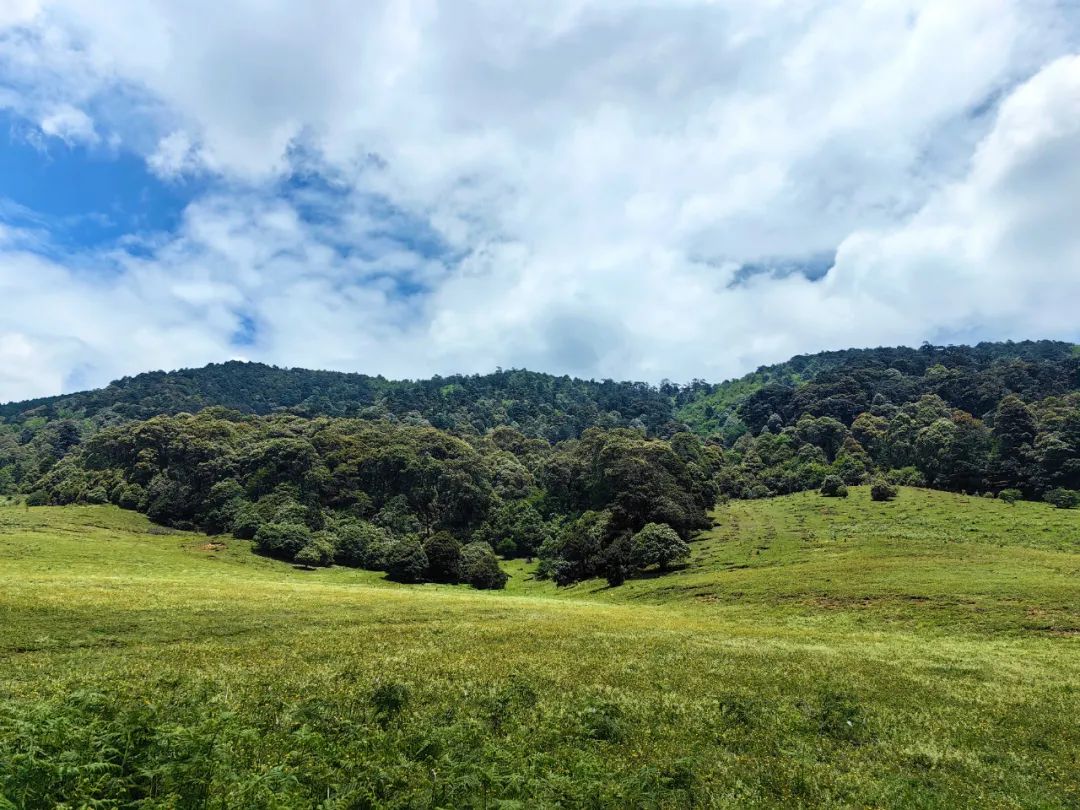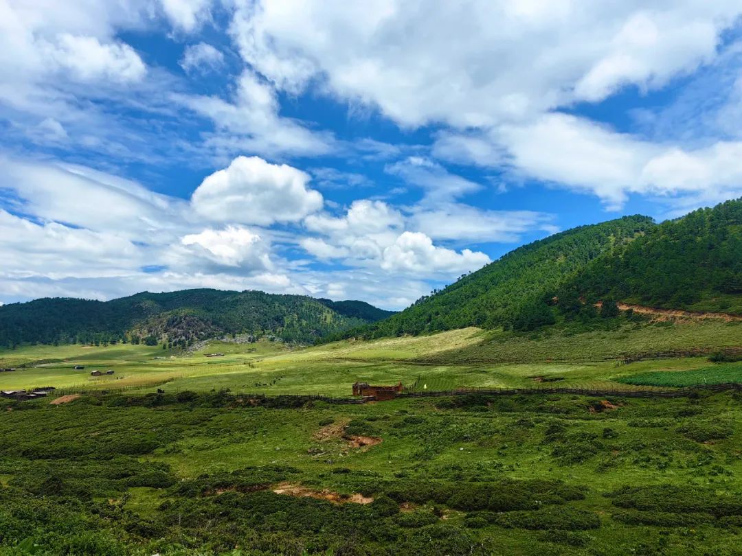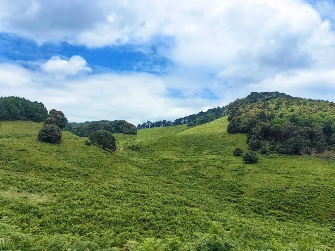 行走在草地上,青草的味道夾雜著泥土的氣息迎面撲來,腳下柔軟而富有彈性的感覺非常美妙,仿佛行走在宮崎駿的動畫里。沿著草甸蜿蜒的路繼續(xù)前行,大片大片綠油油的草甸浮現(xiàn)眼前。站在草甸上極目遠眺,起伏連綿,遼闊無邊的大草甸像是一塊天工織就的綠色巨毯,鋪滿了這里的大地,猶如一幅醉美的畫卷、一首雋秀的詩歌。