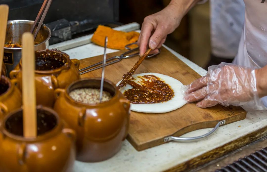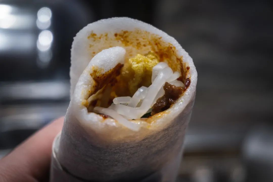 中間可以夾油條、云腿絲、牛羊肉片或者雞蛋、蔬菜,最后卷在一起。