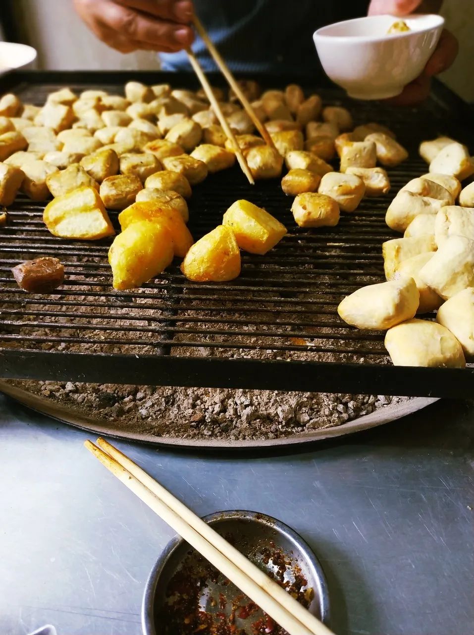 熱乎乎的烤豆腐,蘸著醬油、辣椒末、蒜泥、小米辣吃。