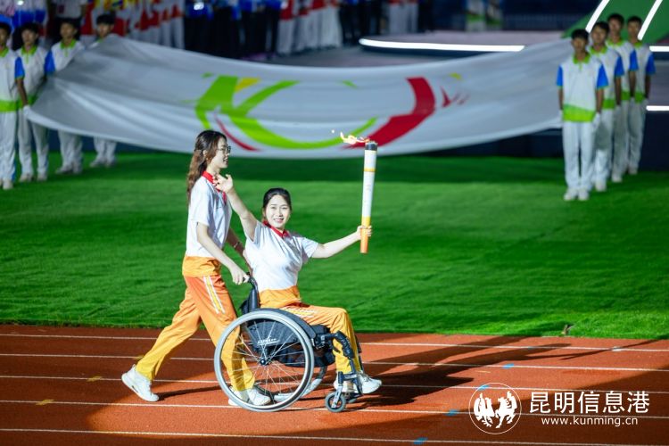 圣火傳遞環(huán)節(jié),一只特意設(shè)計的鳳凰飛躍球場上空,銜火而來,尋甸籍運動員——2021殘奧會冠軍周艷菲,接過鳳凰口中的火焰,與尋甸縣各行各業(yè)優(yōu)秀代表接力傳遞,共同點燃運動會的圣火。一首激情洋溢、活力滿滿的《相約七運》拉開了文藝演出的序幕。演出分為《和美昆明 山水尋甸》《薪火傳承 紅色尋甸》《魅力春城 生態(tài)尋甸》《民族同心 金彩尋甸》《暢想昆明 尋夢未來》5個篇章,全方位展現(xiàn)了昆明尋甸熱情好客、拼搏進取、展望未來的風(fēng)采。