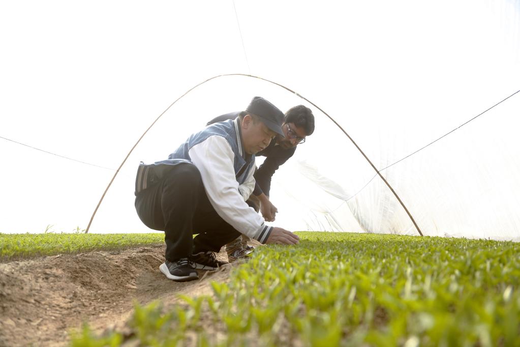 巴基斯坦旁遮普省木爾坦的中巴辣椒訂單種植項目辣椒育苗大棚內,中國農業(yè)專家?guī)ьI巴基斯坦技術員查看辣椒秧苗生長情況。